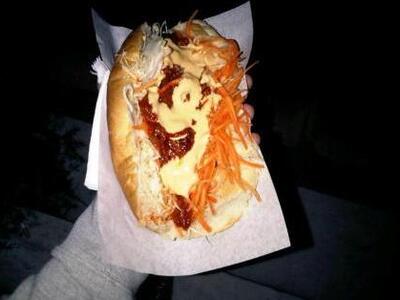 Διπλό λουκάνικο, λάχανο, καρότο και κέτσαπ, μουστάρδα, μαγιονέζα.