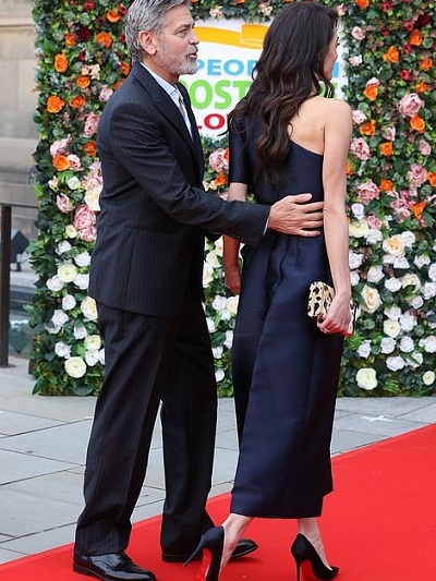 Την Πέμπτη το βραδάκι η Αμάλ έλαμψε σε φιλανθρωπική εκδήλωση λοταρίας στο Εδιμβούργο της Σκωτίας με ολόσωμη μαύρη-μπλε φόρμα της Stella Mc Cartney σε χαλαρή γραμμή και από βαρύ σατέν, που άφηνε τον ένα ώμο έξω. Μια φαρδιά, δερμάτινη ζώνη που αναδείκνυε τη μέση- «δαχτυλίδι» της διάσημης νομικού, λεοπάρ τσαντάκι αλλά και κλασικές γόβες Louboutin συντέλεσαν σε μια περιβολή υπόδειγμα για δημόσια εκδήλωση. Στη θέα του ζευγαριού ο κόσμος ήταν πάρα πολύ εκδηλωτικός και ειδικά τα νεαρά κορίτσια έδειχναν κάτι παραπάνω από ενθουσιασμένα. Πάντα ζεστός και προσιτός, ο Τζορτζ δεν αρνήθηκε selfie φωτογραφίες και μίλησε σε πολλούς από το πλήθος.