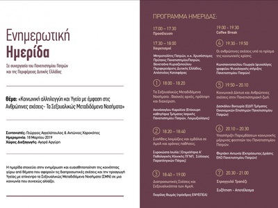 Τη Δευτέρα 18 Μαρτίου 2019, και ώρες 17:00 έως 21:00, στον συνεδριακό χώρο της Αγοράς Αργύρη θα πραγματοποιηθεί ημερίδα με θέμα «Κοινωνική αλληλεγγύη και Υγεία με έμφαση στις Ανθρώπινες σχέσεις- Τα Σεξουαλικώς Μεταδιδόμενα Νοσήματα». Την ημερίδα διοργανώνει το Γραφείο Κοινωνικής Μέριμνας- Δράση ΕΚΟ του Πανεπιστημίου Πατρών, σε συνεργασία με την Περιφέρεια Δυτικής Ελλάδας.