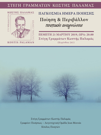 Η «Στέγη Γραμμάτων Κωστής Παλαμάς», το Γραφείον Ποιήσεως, ο Κύκλος Ποιητών και η Λογοτεχνική Ομάδα Jean Moreàs, διοργανώνουν μία Ποιητική Βραδιά στην Πάτρα με αφορμή τον εορτασμό της Παγκόσμιας Ημέρας Ποίησης, την Πέμπτη 21 Μαρτίου 2019, στις 20:00 το βράδυ.
