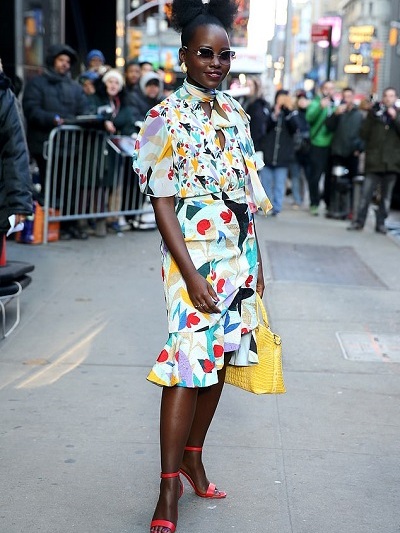 Ο φακός τη λάτρεψε και στις τελευταίες εμφανίσεις για το προμοτάρισμα της ταινίας «Us». Πολυσυζητήθηκε το outfit με διάφανο πανοφώρι Balmain από pvc αλλά και το γκλίτερ φούξια σύνολο Bande Noir που συνδύασε με φουτοριστικά γοβάκια Sergio Rossi και κίτρινους φακούς επαφής! Την είδαμε επίσης με σύνολο Prabal Gurung σε έντονο λουλουδένιο εμπριμέ που επέλεξε για τη δημοφιλή εκπομπή Good Morning America συνδυασμένο με εκκεντρικό χτένισμα, βερικοκί πέδιλα και κατακίτρινο παλτό. Φόρεσε επίσης ένα πλεκτό φόρεμα σε λιλά και κόκκινο από τον ίδιο οίκο, μαζί με στρογγυλά πελώρια γυαλιά και μεγάλους κρίκους.