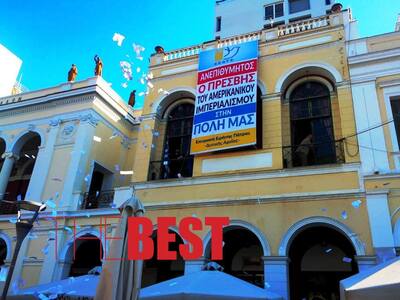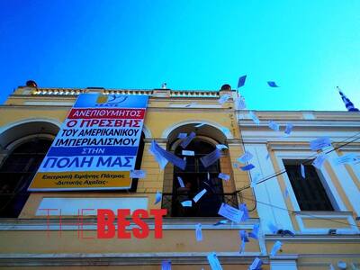 Παράλληλα, πέταξαν από το μπαλκόνι του Μεγάλου Λόγου και Τέχνης φειγ βολάν με αντιαμερικανικά συνθήματα.