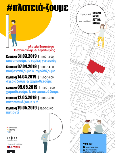 Η ομάδα Commoners Code the City στα πλαίσια του προγράμματος «Αστικά Κοινά» διοργανώνει 6 κυριακές συμμετοχικού σχειδασμού από 31 Μαρτίου έως 19 Μαίου 2019 στην πλατεία Θεσσαλονίκης & Κεφαλληνίας με τίτλο: