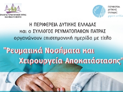 Η Περιφέρεια Δυτικής Ελλάδας σε συνεργασία με τον Σύλλογο Ρευματοπαθών Πάτρας οργανώνουν επιστημονική ημερίδα με θέμα: «Ρευματικά Νοσήματα και Χειρουργεία Αποκατάστασης» για την αποκατάσταση των πασχόντων που εμπλέκονται σε χειρουργικές παρεμβάσεις για τη βελτίωση της κατάστασής τους και την αποκατάστασή τους.