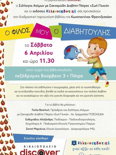 Το βιβλιοπωλείο Discover, ο Σύλλογος Ατόμων με Σακχαρώδη Διαβήτη Πάτρας "Ζωή Γλυκιά" και οι εκδόσεις Ελληνοεκδοτική προσκαλούν το κοινό στην εκδήλωση παρουσίασης του παιδικού βιβλίου με τίτλο, «Ο φίλος μου ο Διαβητούλης» της Κωνσταντίνας Φραντζεσκάκη.