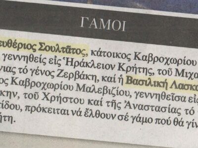 «Ο Ελευθέριος Σουλτάτος, κάτοικος Καβροχωρίου Μαλέβιζίου, γεννηθείς εις Ηράκλειον Κρήτης, του Μιχαήλ και της Σόνιας το γένος Ζερβάκη και η Βασιλική Λασκαράκη, κάτοικος Καβροχωρίου Μελεβιζίου, γεννηθείσα εις Θεσσαλονίκην, του Χρήστου και της Αναστασίας το γένος Βαμβακίδου, πρόκειται να έλθουν σε γάμο που θα γίνει εις την Κρήτη», αναφέρει η γάμηλια αναγγελία του ζευγαριού, η οποία δημοσιεύεται σήμερα στην εφημερίδα «Εστία» .