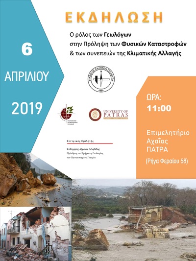 Ο Σύλλογος Ελλήνων Γεωλόγων, το Γεωτεχνικό Επιμελητήριο Ελλάδας και το Τμήμα Γεωλογίας του Πανεπιστημίου Πατρών συνδιοργανώνουν εκδήλωση με θέμα: «Ο Ρόλος των Γεωλόγων στην Πρόληψη των Φυσικών Καταστροφών & των Συνεπειών της Κλιματικής Αλλαγής.