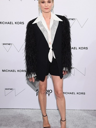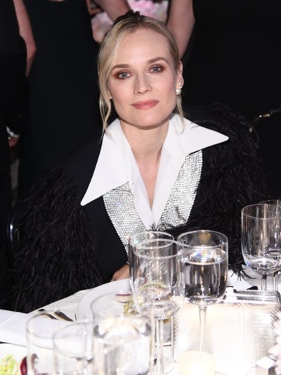 Η 42χρονη Κρούγκερ επέλεξε ασπρόμαυρο outfit Michael Kors- σακάκι με φτερωτά μανίκια και πέτα με αστραφτερά σβαρόβσκι, λευκό ανδρικό πουκάμισο και μαύρο σορτς. Tα διεθνή media σχολίασαν ταχύτατα τα υπέροχα πόδια της, καθώς αν και πρόσφατα απέκτησε το πρώτο της παιδί, δεν της έμεινε ούτε γραμμάριο περιττού βάρους.