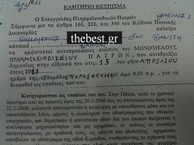Σύμφωνα με αυτό τους καλούν σε δίκη για παρακώλυση συγκοινωνιών, γιατί τον Φεβρουάριο του 2006 και για δυο ημέρες, είχαν κατεβάσει τα φορτηγά και τα μηχανήματα στην Πάτρα, για να διαμαρτυρηθούν εκείνη την εποχή για την τότε πιθανολογούμενη εμπλοκή στην λειτουργία του λατομείου.