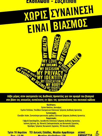 Εκδήλωση στο πλαίσιο της εκστρατείας της Διεθνούς Αμνηστίας με αίτημα την τροποποίηση του άρθρου 336 του ελληνικού Ποινικού Κώδικα, που περιλαμβάνει τον ορισμό του βιασμού, έτσι ώστε αυτός να ορίζεται με βάση την απουσία συναίνεσης, προγραμματίζεται να γίνει την Τρίτη 16.4.2019 στις 12 το μεσημέρι στο ΑΤΕΙ Δυτικής Ελλάδας, Μεγάλο Αμφιθέατρο.