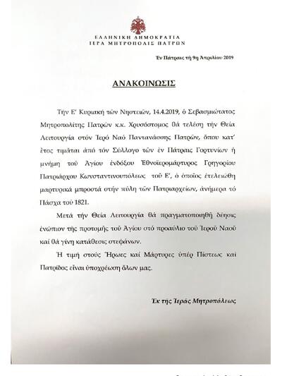 Την Ε’ Κυριακή των Νηστειών 14 Απριλίου 2019, ο σεβασμιότατος Μητροπολίτης Πατρών κ.κ. Χρυσόστομος θα τελέσει όπως αναφέρει σχετική ανακοίνωση τη Θεία λειτουργία στον ιερό ναό Παντανάσσης όπου κατ’ έτος τιμάται πάντα τέτοιες μέρες από το Σύλλογο των εν Πάτραις Γορτυνίων η μνήμη του Αγίου ενδόξου εθνοιερομάρτυρος Γρηγορίου Αρχιεπισκόπου Κωνσταντινουπόλεως του Ε΄, ο οποίος ετελειώθη μαρτυρικά μπροστά στην Πύλη του Πατριαρχείου από τους Τούρκους ανήμερα το Πάσχα του 1821.