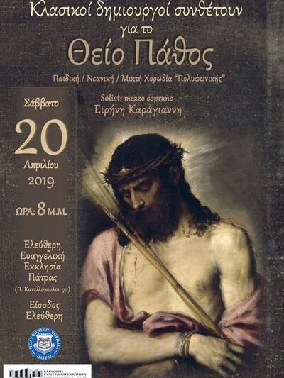 Στο πνεύμα της κατάνυξης των αγίων ημερών της Μεγάλης Εβδομάδας εντάσσεται η συναυλία της Μικτής Χορωδίας της Πολυφωνικής με τίτλο «Κλασικοί δημιουργοί συνθέτουν για το Θείο Πάθος» που προγραμματίζεται για το Σάββατο του Λαζάρου 20 Απριλίου 2019 στην Ελεύθερη Ευαγγελική Εκκλησία στην οδό Κανελλοπούλου 72, στην Πάτρα, στις 20.00 το βράδυ, με ελεύθερη είσοδο για το κοινό.
