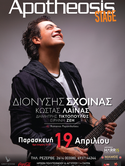 Ο Διονύσης Σχοινάς έχει επιστρέψει δυναμικά στη δισκογραφία και στα νυχτερινά δρώμενα. Τα τραγούδια του έχουν αγαπηθεί πολύ και σε κάθε του εμφάνιση το κέφι και η διασκέδαση χτυπάνε κόκκινο. Είναι η καινούρια μόδα και ο καινούριος τρόπος διασκέδασης και όπου εμφανίζεται προκαλεί πανικό. Το Apotheosis Stage σε συνεργασία με την Harris The Events και τον Χάρη Παναγόπουλο και ο Διονύσης Σχοινάς (με ολο το σχήμα του από την Αθήνα) μάς προσκαλούν σε ένα μεγάλο πάρτυ αυτή την Παρασκευή 19 Απριλίου στις 23:30 και μάς υπόσχονται μια αξέχαστη βραδιά. Εξάλλου, μάς έχουν συνηθίσει σε μοντέρνα και πρωτοποριακά πράγματα!