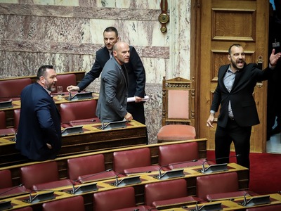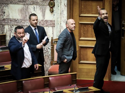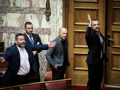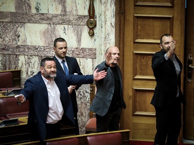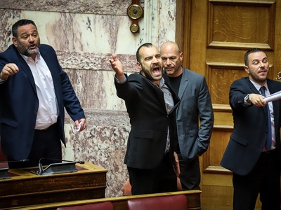 Οι βουλευτές της ΧΑ επιτέθηκαν με υβριστικές εκφράσεις κατά βουλευτών που διαμαρτύρονταν για όσα είπε ο Ευ. Καρακώστας, με φράσεις όπως «είσαι Καραγκιόζης», «είστε δολοφόνοι».
