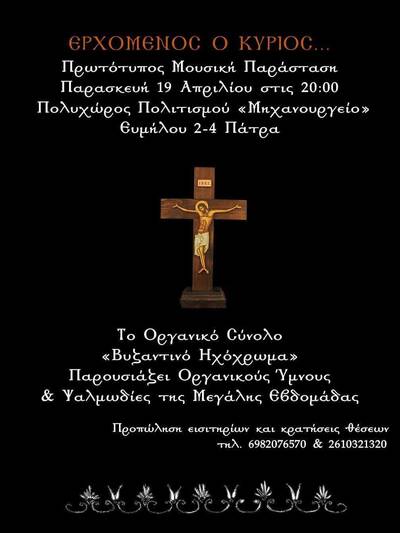 Στο πνεύμα των αγίων ημερών της Μεγάλης Εβδομάδας διοργανώνεται μια ξεχωριστή Μουσική Παράσταση του Οργανικού Συνόλου «Βυζαντινό Ηχόχρωμα» που θα γίνει αυτή την Παρασκευή 19 Απριλίου στις 20:00 στον Πολυχώρο Πολιτισμού Μηχανουργείο δίπλα από την Αρχιεπισκοπή Πατρών, στην οδό Ευμήλου 2, πίσω από το ναό του Αγίου Ανδρέου.