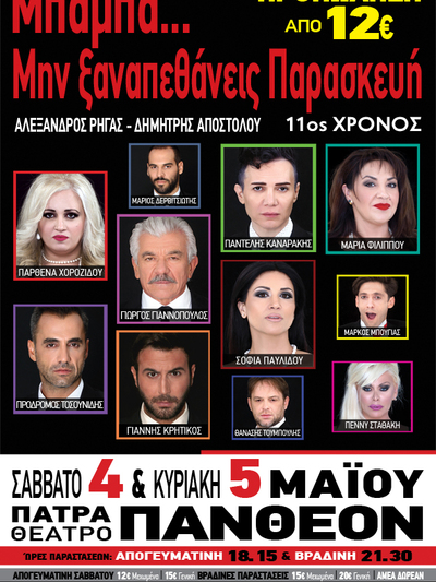 Η παράσταση «Μπαμπά… Μην Ξαναπεθάνεις Παρασκευή», που έγραψε της δική της ιστορία στα θεατρικά δρώμενα, ολοκληρώνεται οριστικά και θα βρίσκεται στην Πάτρα για 2 ημέρες Σάββατο 4 και Κυριακή 5 Μαΐου.