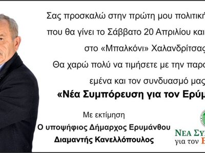 Tην πρώτη εκδήλωση με την οποία θα δοθεί και επίσημα η εκκίνηση του προεκλογικού αγώνα θα πραγματοποιήσει σήμερα στις 21:00 στο «Μπαλκόνι» Χαλανδρίτσας ο συνδυασμός «Νέα Συμπόρευση για τον Ερύμανθο» με επικεφαλής και υποψήφιο Δήμαρχο Ερυμάνθου, τον Διαμαντή Κανελλόπουλο.