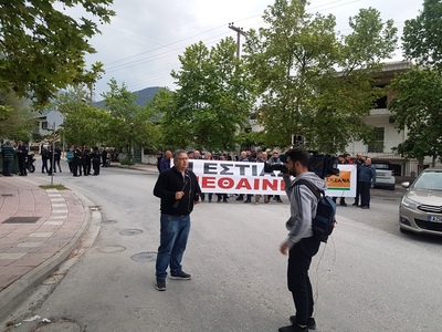 «Πολυμελής αντιπροσωπεία του Σ.Κ.Ε.Α.Ν.Α έκανε έντονη την παρουσία της με χαρακτηριστικό πανό, έξω από το κλειστό στάδιο της Περιβόλας, αναμένοντας την έλευση του Πρωθυπουργού, Αλέξη Τσίπρα.