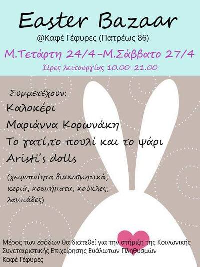 Πασχαλινό παζάρι διοργανώνεται στο Καφέ Γέφυρες (Πατρέως 86) από τη Μ. Τετάρτη έως και το Μ. Σάββατο, και ώρες 10:00-21:00. Στο παζάρι θα βρείτε χειροποίητα διακοσμητικά, αρωματικά κεριά, κοσμήματα, κουκλίτσες και φυσικά λαμπάδες για μικρούς και μεγάλους, Όλα φτιαγμένα με χρώματα της Άνοιξης και πολλή αγάπη!