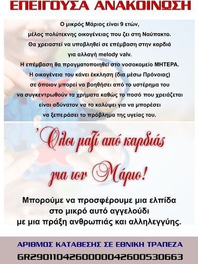 Ο μικρός Μάριος είναι 9 ετών, μέλος πολύτεκνης οικογένειας που ζει στη Ναύπακτο. Θα χρειαστεί να υποβληθεί σε επέμβαση στην καρδιά για αλλαγή melody valv. Η επέμβαση θα πραγματοποιηθεί στο νοσοκομείο ΜΗΤΕΡΑ. Η οικογένειά του, κάνει έκκληση (δια μέσω πρόνοιας) σε όποιον μπορεί να βοηθήσει από το υστέρημά του να συγκεντρωθούν τα χρήματα καθώς το ποσό που χρειάζεται είναι αδύνατον να το καλύψει για να μπορέσει να ξεπεράσει το πρόβλημα της υγείας του.