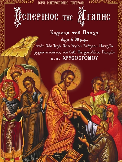 Το απόγευμα της Κυριακής του Πάσχα 28 Απριλίου 2019 στις 18.00 θα τελεστεί όπως κάθε χρόνο στο νέο ιερό ναό του Αγίου Ανδρέου Πατρών ο Εσπερινός της Αγάπης χοροστατούντος του σεβασμιοτάτου Μητροπολίτη Πατρών κ.κ. Χρυσοστόμου και συγχοροστατούντος του Θεοφιλεστάτου Επισκόπου Κερνίτσης κ. Χρυσάνθου που θα πλαισιώνονται από πολλούς ιερείς.