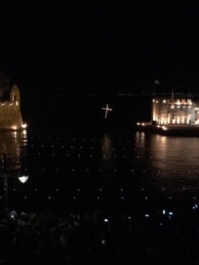 Γεμάτο από χιλιάδες κόσμο το λιμανάκι της Ναυπάκτου αναμένει την άφιξη των επιραφίων και της πομπής στο σκοτάδι. Η μόνη πηγή φωτός είναι οι φωτιές που έχουν ανάψει πάνω στο τείχος και μέσα στη θάλασσα. Εκείνος που ξεχωρίζει είναι ο φλεγόμενος σταυρός που κρέμεται στην είσοδο του λιμανιού.