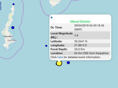 Ισχυρότατος σεισμός «ξύπνησε» το πρωί της Δευτέρας του Πάσχα (29.04.2019) την Κάρπαθο. Ήταν λίγο πριν από τις 07:45 το πρωί όταν οι σεισμογράφοι κατέγραψαν τα Ρίχτερ. Ο σεισμός, που σημειώθηκε στην θαλάσσια περιοχή 64 χιλιόμετρα ανατολικά, νοτιοανατολικά της Καρπάθου, ήταν 4,9 βαθμών της Κλίμακας Ρίχτερ.