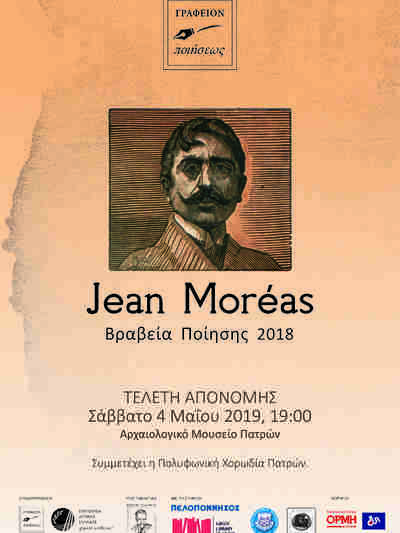 Η τελετή απονομής των βραβείων Ποίησης Jean Moreas 2018 προγραμματίζεται να γίνει το Σάββατο 4 Μαΐου 2019 στην Πάτρα. Πιο συγκεκριμένα το Γραφείον Ποιήσεως συνεχίζοντας τις δράσεις του για την ποίηση διοργανώνει την τελετή απονομής των ετήσιων Βραβείων Ποίησης “Jean Moreas” για τα βιβλία που εκδόθηκαν ανά το πανελλήνιο το 2018, το Σάββατο 4 Μαΐου 2019 στις 19.00 στο Αμφιθέατρο του νέου Αρχαιολογικού Μουσείου Πάτρας.
