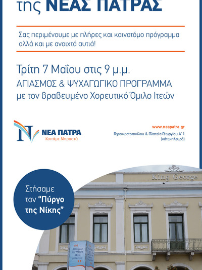 Αγιασμός και ψυχαγωγικό πρόγραμμα με τον βραβευμένο χορευτικό όμιλο Ιτεών θα πραγματοποιηθεί την Τρίτη στις 9 το βράδυ στο εκλογικό κέντρο της Νέας Πάτρας, του δημοτικού συνδυασμου του Νίκου Νικολόπουλου.Το εκλογικό κέντρο βρίσκεται στη συμβολή της Γεροκωστοπούλου με την πλατεία Γεωργίου (κατω πλευρά)