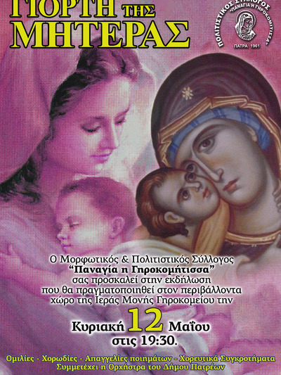 Ο Μορφωτικός & Πολιτιστικός Σύλλογος της Πάτρας "Παναγία η Γηροκομήτισσα" προσκαλεί το κοινό στην εκδήλωση για τη Γιορτή της Μητέρας που προγραμματίζεται να γίνει την Κυριακή 12 Μαΐου 2019 στις 19:30 το απόγευμα στον καταπράσινο περιβάλλοντα χώρο της Ιεράς Μονής Γηροκομείου.