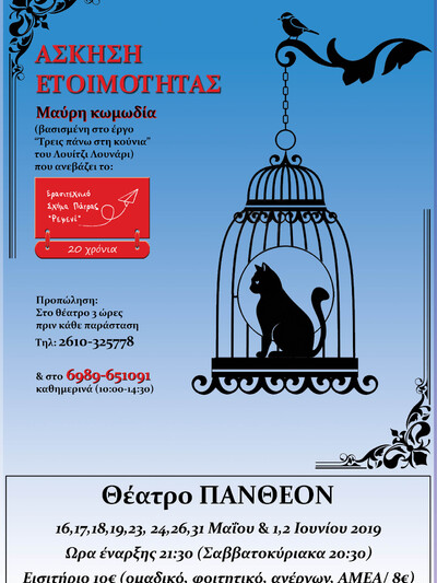 «Άσκηση Ετοιμότητας» λέγεται η μαύρη κωμωδία που θ’ ανέβει στο θέατρο Πάνθεον στη Δημ. Γούναρη στην Πάτρα από το Ερασιτεχνικό Σχήμα Πάτρας «Ρεφενέ», το οποίο και γιορτάζει 20 χρόνια θεατρικής δημιουργίας και αξιόλογης παρουσίας. Ανεβάζει λοιπόν από τις 16 Μαΐου 2019 την κωμωδία «Άσκηση ετοιμότητας», βασισμένη στο θεατρικό του Λουίτζι Λουνάρι «Τρεις πάνω στη κούνια» (1990).