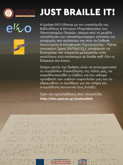 Η Δράση ΕΚΟ UPatras με την υποστήριξη της Βιβλιοθήκης & Κέντρου Πληροφόρησης του Πανεπιστημίου Πατρών, ύστερα από τη μεγάλη προσέλευση των καταστηματαρχών εστίασης και αναψυχής στο περίπτερο της στην 6η Έκθεση Καινοτομίας & Μεταφοράς Τεχνογνωσίας – Patras Innovation Quest (PATRAS IQ) στο νέο Λιμάνι της Πάτρας για να μετατρέψουν τους καταλόγους τους σε μορφή Braille δωρεάν, αποφάσισε να διατηρήσει την υπηρεσία μετατροπής σε Braille 1 καταλόγου/κατάστημα καθ’ όλη τη διάρκεια του έτους.