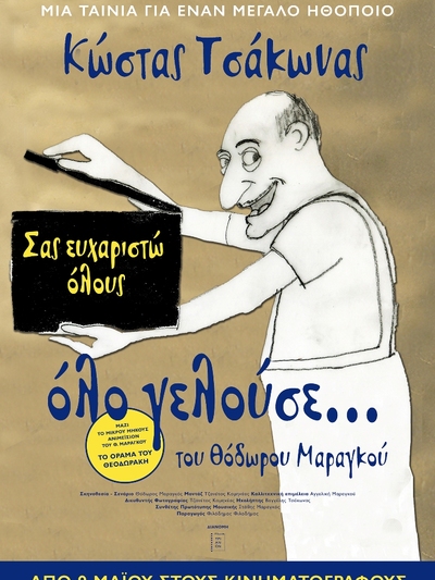 Το ντοκιμαντέρ με τίτλο «Όλο γελούσε» σε σκηνοθεσία του Θόδωρου Μαραγκού παίζεται από την περασμένη Πέμπτη 9 Μαΐου στους κινηματογράφους της Αθήνας, από τη Filmcenter Τριανόν μαζί με το μικρού μήκους animation του Θόδωρου Μαραγκού «Το όραμα του Θοδωράκη».