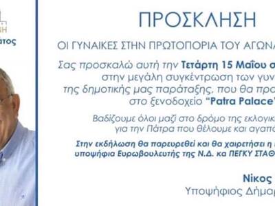 Σε ανακοίνωση του συνδυασμού του υποψηφίου Δημάρχου Πατρέων Νίκου Παπαδημάτου αναφέρεται: "Σε μεγάλη συγκέντρωση νίκης αναμένεται να μετατραπεί η εκδήλωση για τις γυναίκες που διοργανώνει η δημοτική παράταξη «Πάτρα Ενωμένη- Νίκος Παπαδημάτος», την προσεχή Τετάρτη 15 Μαϊου, στις 8μμ, στο ξενοδοχείο «Patra Palace».
