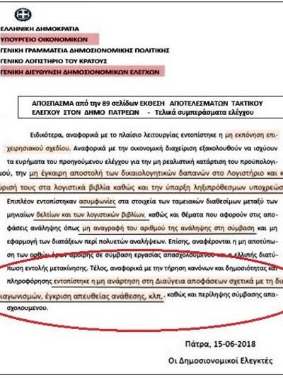 «Υπάρχει έκθεση αποτελεσμάτων τακτικού ελέγχου στον Δήμο Πατρέων από το Υπουργείο Οικονομικών και συγκεκριμένα από τη Γενική Διεύθυνση Δημοσιονομικών Ελέγχων για την ελεγκτική περίοδο από 1 Ιουλίου του 2017 έως 30 Ιουνίου του 2018, έκτασης 89 σελίδων που χρήζει άμεσης ηθικής και όχι μόνο, διερεύνησης.