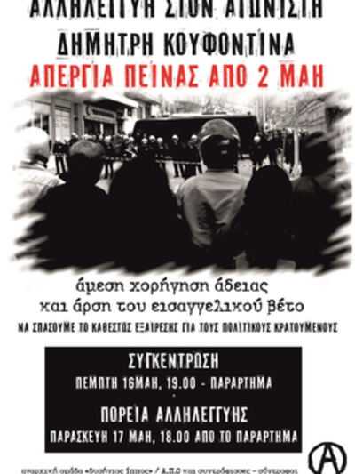 Πορεία αλληλεγγύης για τον Δημήτρη Κουφοντίνα, θα πραγματοποιήσουν το απόγευμα ομάδες αντιεξουσιαστών . Το "ραντεβού" έχει δοθεί στις 6.00 μμ στο παράρτημα της οδού Κορίνθου.