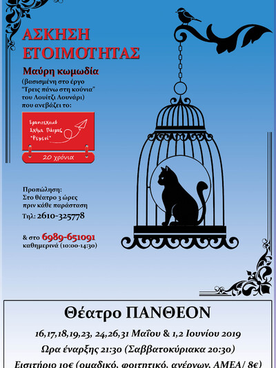 Προπώληση: Στο θέατρο Πάνθεον 3 ώρες πριν κάθε παράσταση, τηλ: 2610-325778 & στο 6989-651091 καθημερινά (10:00-14:30).