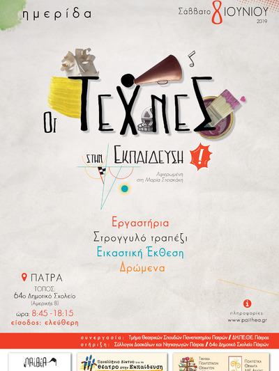 Η Θεατροπαιδαγωγική Ομάδα ΠΑιΘέΑ σε συνεργασία με το Πανελλήνιο Δίκτυο για το Θέατρο στην Εκπαίδευση και τα Τμήματα Πολιτιστικών Θεμάτων Πρωτοβάθμιας και Δευτεροβάθμιας Εκπαίδευσης Αχαΐας διοργανώνουν μία Ημερίδα με θέμα "Οι τέχνες στην εκπαίδευση" το Σάββατο 8 Ιουνίου 2019 από τις 8:45 π.μ. έως τις 6:15 το απόγευμα.