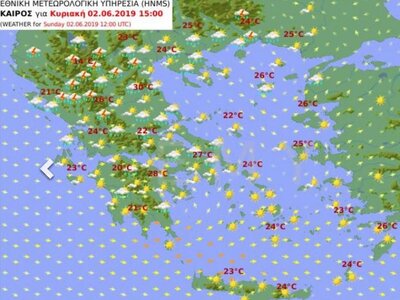 O προγνωστικός χάρτης της ΕΜΥ για το μεσημέρι της Κυριακής των εκλογών / Πηγή: HNMS.GR