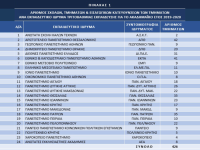 Όπως προκύπτει από τους πίνακες του αριθμού εισακτέων που ανακοινώθηκαν δεν θα υπάρχουν Τεχνολογικά Ιδρύματα (ΤΕΙ) εκτός από την ΑΣΠΑΙΤΕ και τις Ανώτερες Σχολές Τουριστικής Εκπαίδευσης, τα πτυχία των οποίων είναι ισότιμα με των ΤΕΙ. Η μετατροπή με συνοπτικές διαδικασίες του ΤΕΙ Κρήτης σε πανεπιστήμιο με το όνομα Ελληνικό Μεσογειακό Πανεπιστήμιο, η συγχώνευση των ΤΕΙ Ανατολικής Μακεδονίας και Θράκης, ΤΕΙ Κεντρικής Μακεδονίας, ΤΕΙ Θεσσαλονίκης και Διεθνούς Πανεπιστημίου και οι άλλες συγχωνεύσεις προώθησαν μια «τεχνητή πανεπιστημιοποίηση» των ΤΕΙ. Για το ακαδημαϊκό έτος 2019-2020 θα λειτουργήσουν 426 πανεπιστημιακά τμήματα και εισαγωγικές κατευθύνσεις τμημάτων.