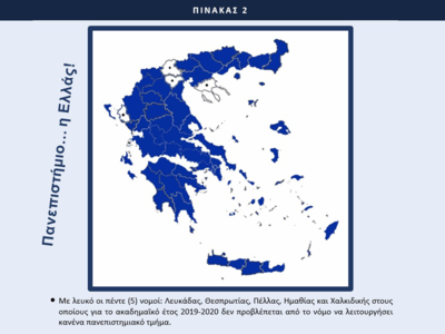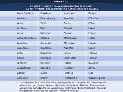 Ειδικότερα, το ακαδημαϊκό έτος 2019-2020 56 πόλεις ή πρωτεύουσες νομών της ελληνικής επικράτειας θα έχουν τουλάχιστον ένα πανεπιστημιακό τμήμα, αριθμός που θα αυξηθεί το επόμενο έτος και θα φτάσει τις 62 πόλεις.