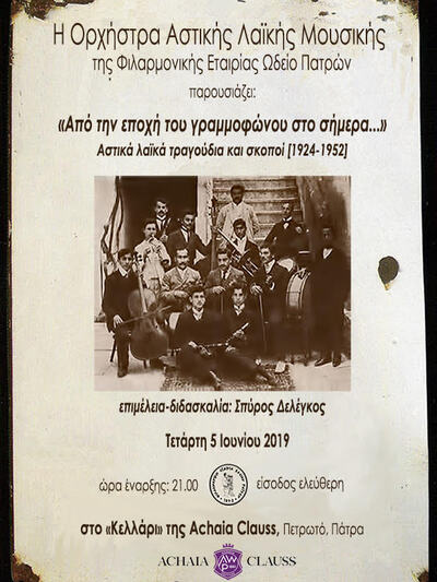 Δύο ιστορικοί χώροι της Πάτρας με διαδρομή από τον 19ο αιώνα μέχρι σήμερα σμίγουν μέσα από ένα μουσικό ταξίδι με όχημα την ελληνική αστική λαϊκή μουσική του γραμμοφώνου: Η Φιλαρμονική Εταιρία Ωδείο Πατρών (1892-) και το οινοποιείο της Achaia Clauss (1861-) παρουσιάζουν την “Ορχήστρα Αστικής Λαϊκής Μουσικής” στη μουσική εκδήλωση με τίτλο: «Από την εποχή του γραμμοφώνου στο σήμερα… Αστικά λαϊκά τραγούδια και σκοποί (1924-1952)».