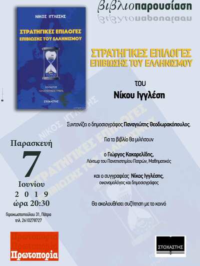 Το βιβλίο του Νίκου Ιγγλέση «Στρατηγικές Επιλογές επιβίωσης του Ελληνισμού» πρόκειται να παρουσιαστεί σε εκδήλωση την Παρασκευή 7 Ιουνίου 2019 στην Πάτρα, στο χώρο του βιβλιοπωλείου Πρωτοπορία στην οδό Γεροκωστοπούλου 31, στις 20.30. Θα μιλήσουν ο Γιώργος Κακαρελίδης, λέκτωρ του Πανεπιστημίου Πατρών, μαθηματικός και ο ίδιος ο συγγραφέας που είναι και οικονομολόγος & δημοσιογράφος. Τον συντονισμό θα κάνει ο δημοσιογράφος της ΕΡΤ, Τάκης Θεοδωρακόπουλος.