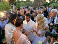 Πανέμορφη και εκθαμβωτική η νύφη Σοφία Μαριόλα φορούσε νυφικό του Βλάσση Χολέβα, με δαντέλα στο μπούστο, ανοιχτή πλάτη και έδινε την αίσθηση ότι γυαλίζει! Τα ξανθά μακριά μαλλιά της τα άφησε ελεύθερα ενώ έβαλε ένα διακριτικό αξεσουάρ!