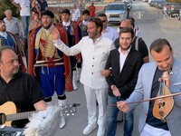 Ο γαμπρός πήγε στην εκκλησιά περπατώντας, συνοδευόμενος απο κρητικούς καλλιτέχνες και βρακοφόρους.