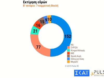 Στο πρώτο σενάριο αυτοδυναμίας της ΝΔ, με εξακομματική Βουλή, η ΝΔ επιτυγχάνει αυτοδυναμία, συγκεντρώνοντας 156 έδρες, έναντι 80 του ΣΥΡΙΖΑ, 21 του ΚΙΝΑΛ, 17 του ΚΚΕ, 15 της ΧΑ και 11 του ΜέΡΑ 25. Στο δεύτερο, με επτακομματική Βουλή, η ΝΔ επιτυγχάνει αυτοδυναμία με 152 έδρες έναντι 77 του ΣΥΡΙΖΑ, 21 του ΚΙΝΑΛ, 16 του ΚΚΕ, 15 εδρών της ΧΑ, 10 του ΜέΡΑ 25 και 9 εδρών της Ελληνικής Λύσης που κατορθώνει να εισέλθει στην εθνική αντιπροσωπεία. Στο τρίτο σενάριο, με πεντακομματική Βουλή, η ΝΔ μπορεί να φτάσει τις 161 έδρες, με τον ΣΥΡΙΖΑ να συγκεντρώνει 83 έδρες, το ΚΙΝΑΛ 22, το ΚΚΕ 18 και τη ΧΑ 16 έδρες.