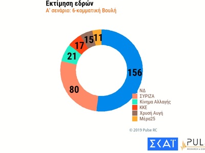 Στο πρώτο σενάριο αυτοδυναμίας της ΝΔ, με εξακομματική Βουλή, η ΝΔ επιτυγχάνει αυτοδυναμία, συγκεντρώνοντας 156 έδρες, έναντι 80 του ΣΥΡΙΖΑ, 21 του ΚΙΝΑΛ, 17 του ΚΚΕ, 15 της ΧΑ και 11 του ΜέΡΑ 25. Στο δεύτερο, με επτακομματική Βουλή, η ΝΔ επιτυγχάνει αυτοδυναμία με 152 έδρες έναντι 77 του ΣΥΡΙΖΑ, 21 του ΚΙΝΑΛ, 16 του ΚΚΕ, 15 εδρών της ΧΑ, 10 του ΜέΡΑ 25 και 9 εδρών της Ελληνικής Λύσης που κατορθώνει να εισέλθει στην εθνική αντιπροσωπεία. Στο τρίτο σενάριο, με πεντακομματική Βουλή, η ΝΔ μπορεί να φτάσει τις 161 έδρες, με τον ΣΥΡΙΖΑ να συγκεντρώνει 83 έδρες, το ΚΙΝΑΛ 22, το ΚΚΕ 18 και τη ΧΑ 16 έδρες.