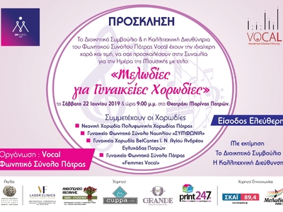 Στο πλαίσιο των εορτασμών για την την 20η επέτειο της Ευρωπαϊκής ημέρα της Μουσικής, το «Vocal Φωνητικό Σύνολο Πάτρας», διοργανώνει συνάντηση γυναικείων χορωδιών με τίτλο «Μελωδίες για Γυναικείες Χορωδίες», το Σάββατο 22 Ιουνίου 2019 στις 21.00 το βράδυ στο Θεατράκι Μαρίνας Πατρών.