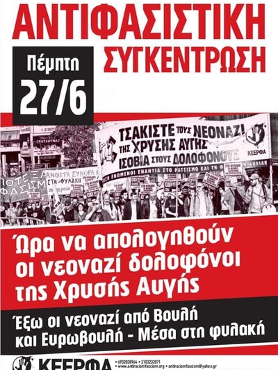Την Πέμπτη και η Πάτρα θα φωνάξει «Έξω από την Βουλή οι νεοναζί-Μέσα στην φυλακή». Καλούμε τη νεολαία και την εργατική τάξη, τα σωματεία και τους φοιτητικούς συλλόγους, όλη την Αριστερά και τους αγωνιστές του κινήματος να βρεθούν την Πέμπτη στην πλατεία Γεωργίου. Καλούμε την Δημοτική Αρχή, που ορθά δεν παραχωρεί χώρους στους νεοναζί, να βρεθεί στον δρόμο εκείνη την μέρα. Όλοι την Πέμπτη, στις 7μμ, στην πλατεία Γεωργίου. Για να τελειώνουμε με τους νεοναζί δολοφόνους της Χρυσής Αυγής! Ανταρσία στην Πάτρα