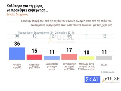 Το ενδεχόμενο αυτοδύναμης κυβέρνησης της ΝΔ προκρίνεται ως η καλύτερη λύση για την χώρα από το 36%, ποσοστό αμετάβλητο σε σχέση με την προηγούμενη δημοσκόπηση, ενώ το 11% απάντησε πως η βέλτιστη επιλογή θα ήταν συνασπισμός με κορμό την Πειραιώς. Ο ΣΥΡΙΖΑ βελτίωσε κατά δύο μονάδες την θέση του, με το 15% να απαντά πως η καλύτερη λύση θα ήταν αυτοδυναμία της Κουμουνδούρου. Το 17% τάσσεται υπέρ της κυβέρνησης συνεργασίας με πυρήνα τον ΣΥΡΙΖΑ.
